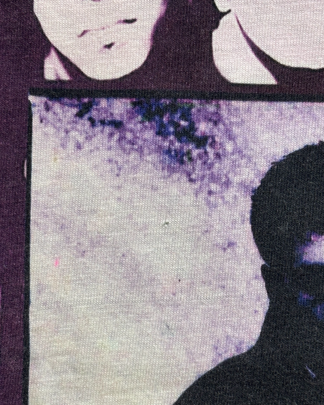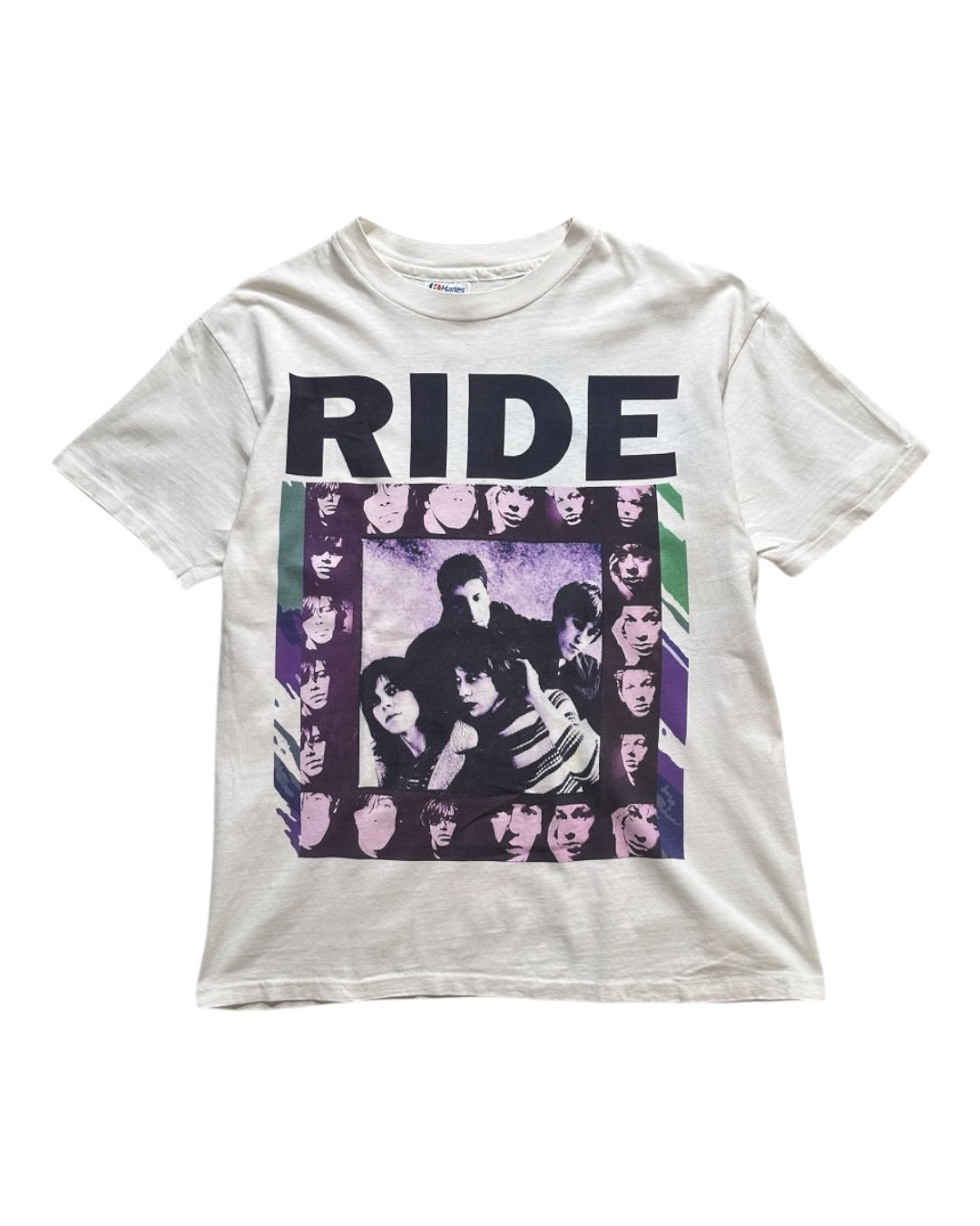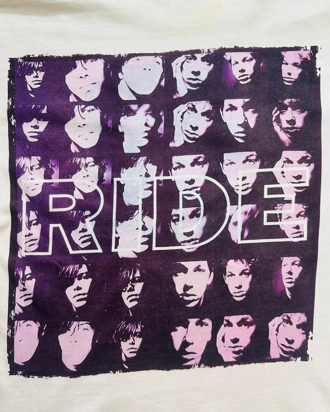 シューゲイザーを代表するバンドRIDE。フロント・バックともに豪華なマルチフォトプリントが入った、バンドの黄金期を象徴する一枚。フロントは大きく配された「RIDE」のロゴの下に、バンドメンバーのフォトを中心としたコラージュ調のグラフィックを配置。周囲には反復されたポートレートがフレーム状に並び、90年代らしいサイケデリックでアート性の高い構成が印象的です。バックも同様に全面フォトプリントで仕上げられています。フェードしたホワイトボディがプリントの雰囲気を一層引き立てています。アンディ・ベル在籍時の当時物は年々市場から姿を消しており、特にこのデザインは非常に希少性が高く、市場で高い評価を受けるRIDEの中でも特にコレクタブルな一枚ではないでしょうか。サイズL