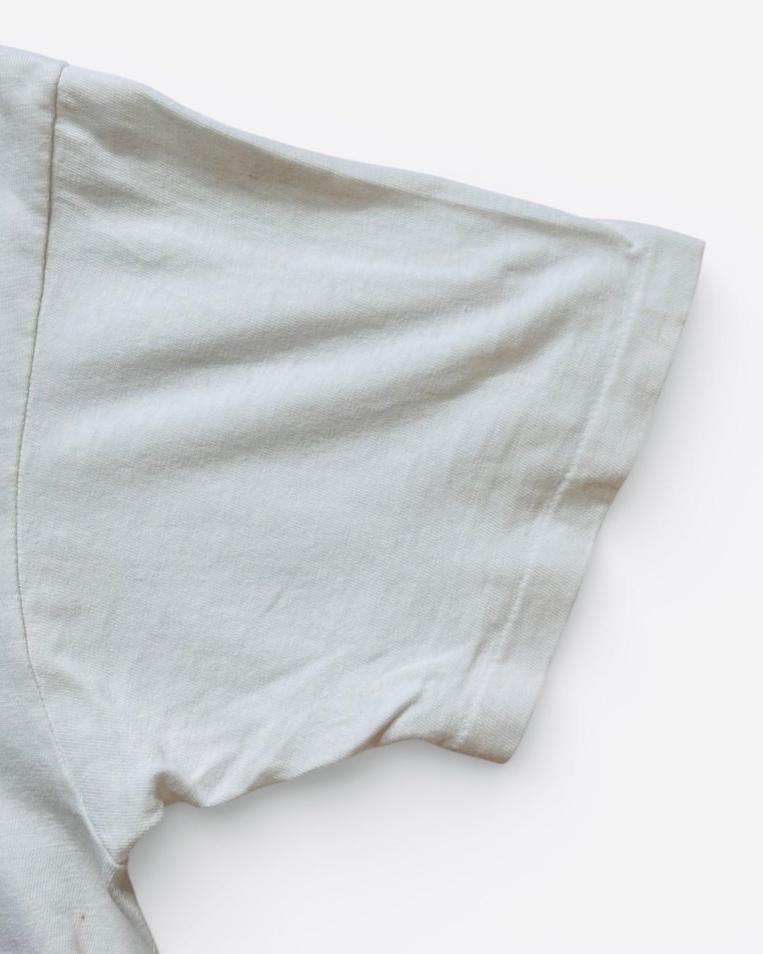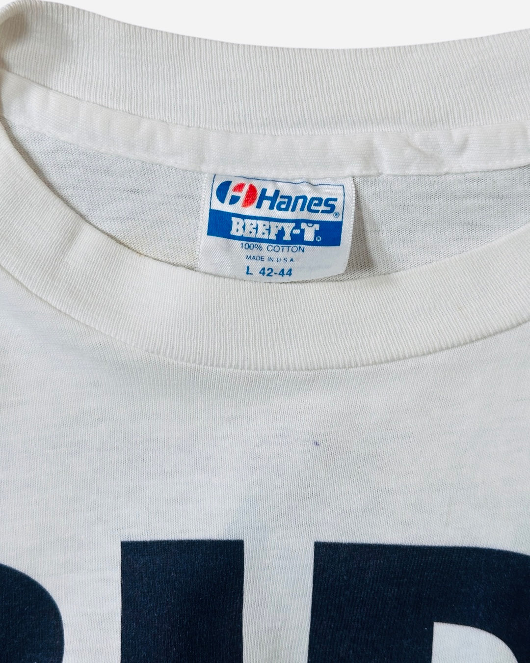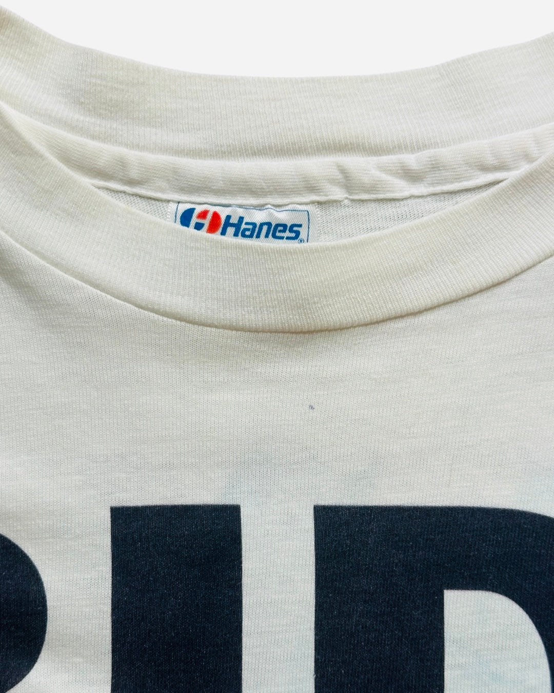 シューゲイザーを代表するバンドRIDE。フロント・バックともに豪華なマルチフォトプリントが入った、バンドの黄金期を象徴する一枚。フロントは大きく配された「RIDE」のロゴの下に、バンドメンバーのフォトを中心としたコラージュ調のグラフィックを配置。周囲には反復されたポートレートがフレーム状に並び、90年代らしいサイケデリックでアート性の高い構成が印象的です。バックも同様に全面フォトプリントで仕上げられています。フェードしたホワイトボディがプリントの雰囲気を一層引き立てています。アンディ・ベル在籍時の当時物は年々市場から姿を消しており、特にこのデザインは非常に希少性が高く、市場で高い評価を受けるRIDEの中でも特にコレクタブルな一枚ではないでしょうか。サイズL
