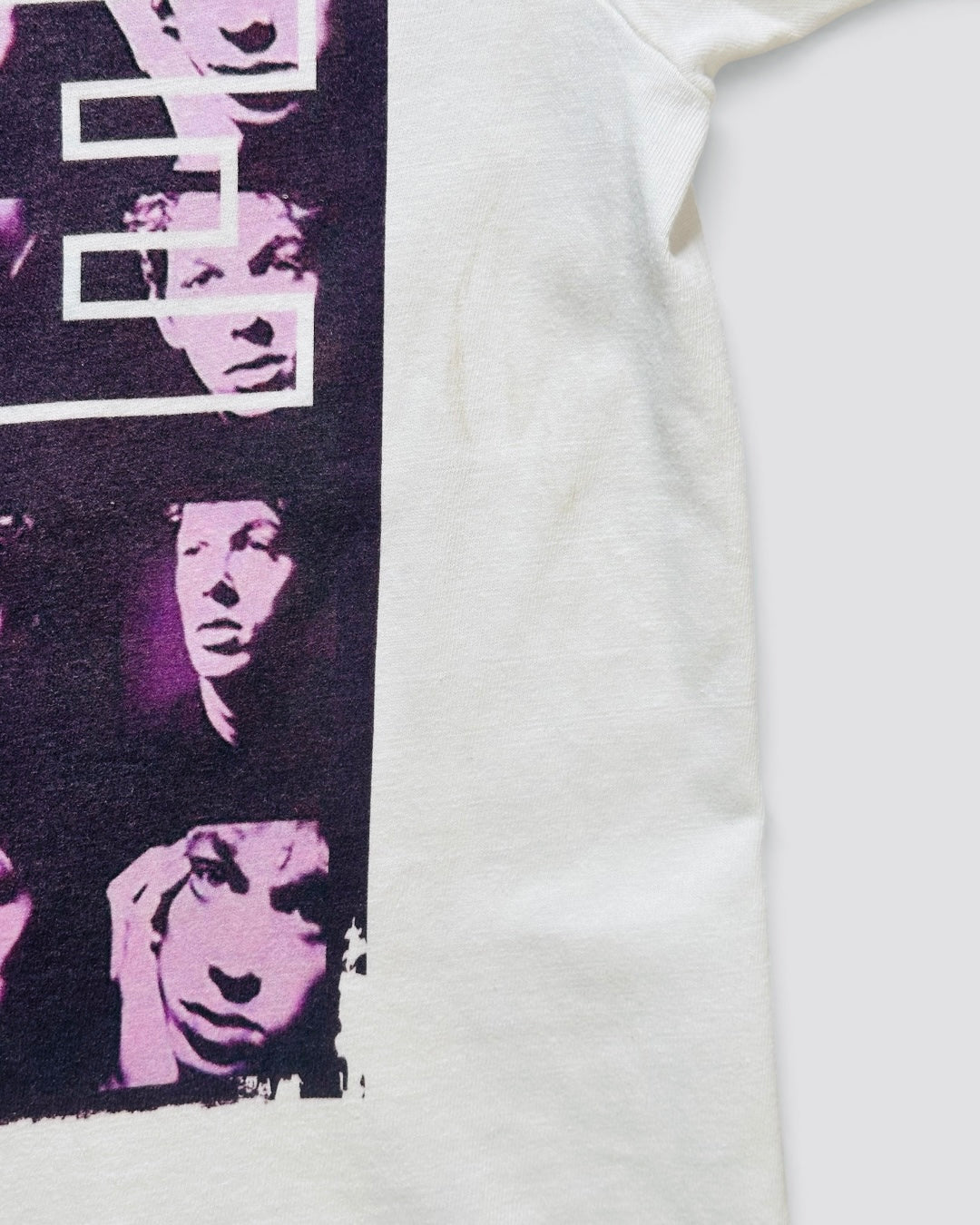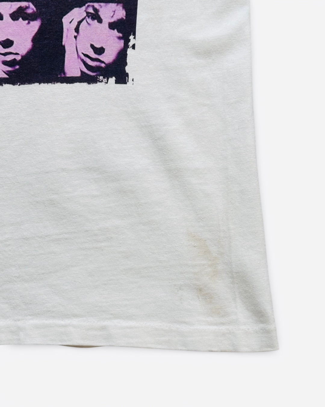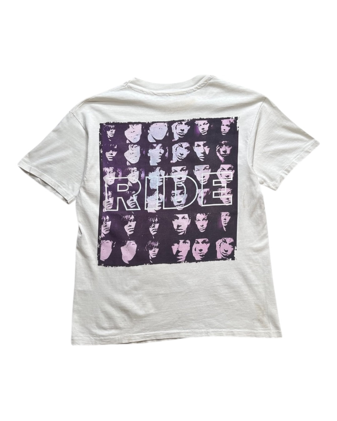 Ride, one of the defining bands of the shoegaze movement. This piece features luxurious multi-photo prints on both the front and back, symbolizing the band’s golden era. The front showcases a bold “RIDE” logo above a collage-style graphic centered around photographs of the band members, with repeated portraits arranged like a frame around the image—an unmistakably ’90s composition rich in psychedelic and artistic sensibility. The back is similarly finished with an all-over photo print. The nicely faded white body further enhances the overall atmosphere of the graphics. Original pieces from the Andy Bell era are becoming increasingly scarce on the market, and this particular design is especially rare—making it one of the most collectible Ride T-shirts, highly regarded among collectors. Size L.