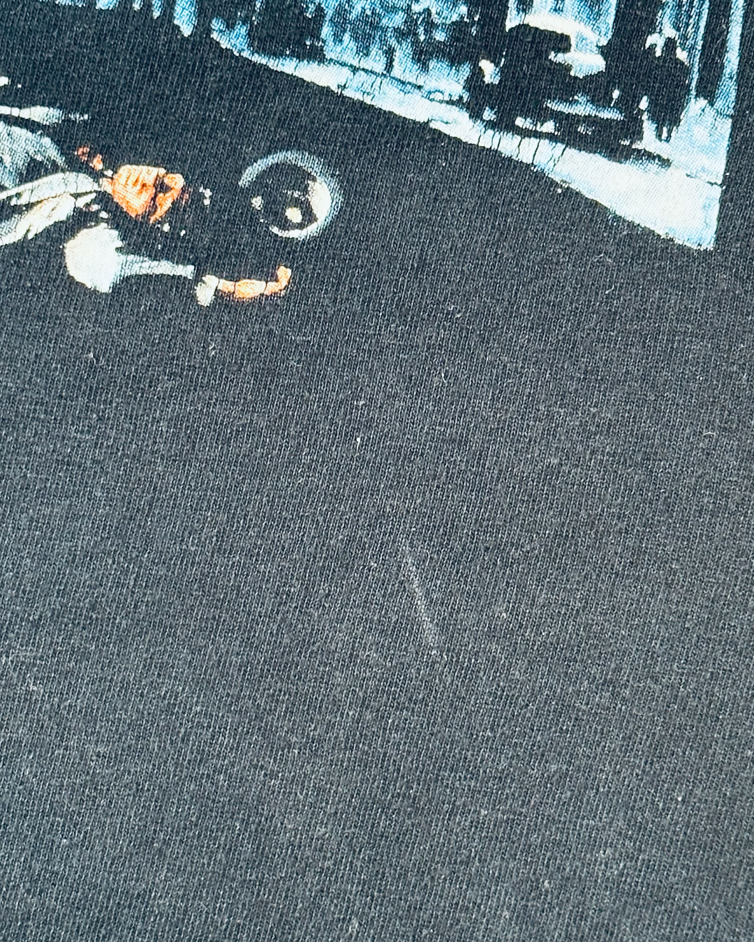 Martin Scorsese’s gangster masterpiece GoodFellas. This T-shirt combines the classic title logo with a blue-toned street scene featuring bodies lying on the ground. The contrast of white and blue on the dark body captures the film’s cool style and the chilling atmosphere of violence. Size XL, with copyright print.
