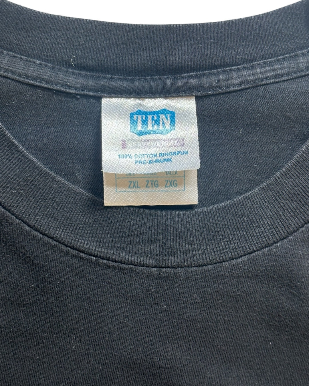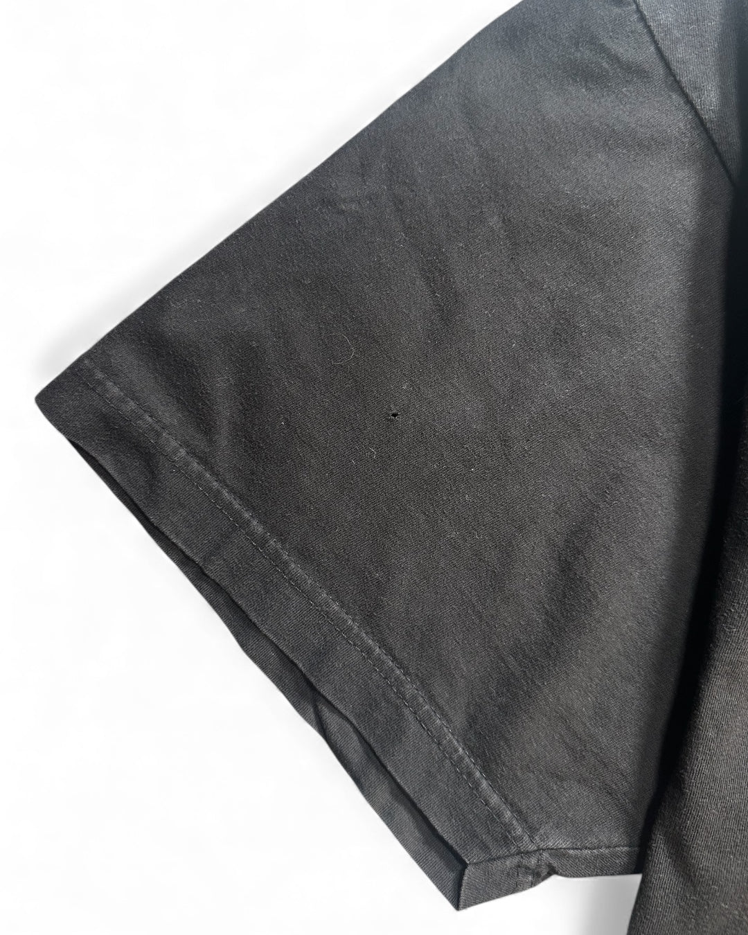 フロント中央には、映画『スカーフェイス』の主人公トニー・モンタナ(アル・パチーノ)の表情を切り取ったモノクロ調のポートレートが大きくプリントされています。顔の上部には、劇中の名台詞「Every day above ground is a good day.」が配置され、その下には作品タイトル「SCARFACE」の文字が重厚な書体でデザイン。全体的にドットの粗いプリントが施され、無骨で存在感のある一枚に仕上がっています。バックプリントが入るパターンは比較的希少性が高いのではないでしょうか。サイズXXL