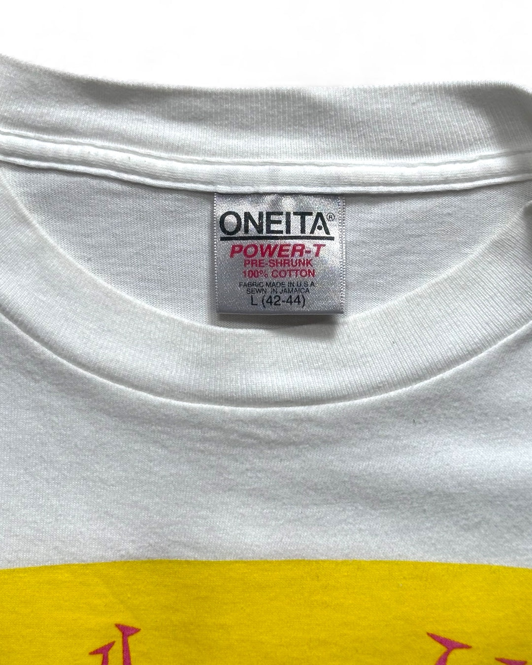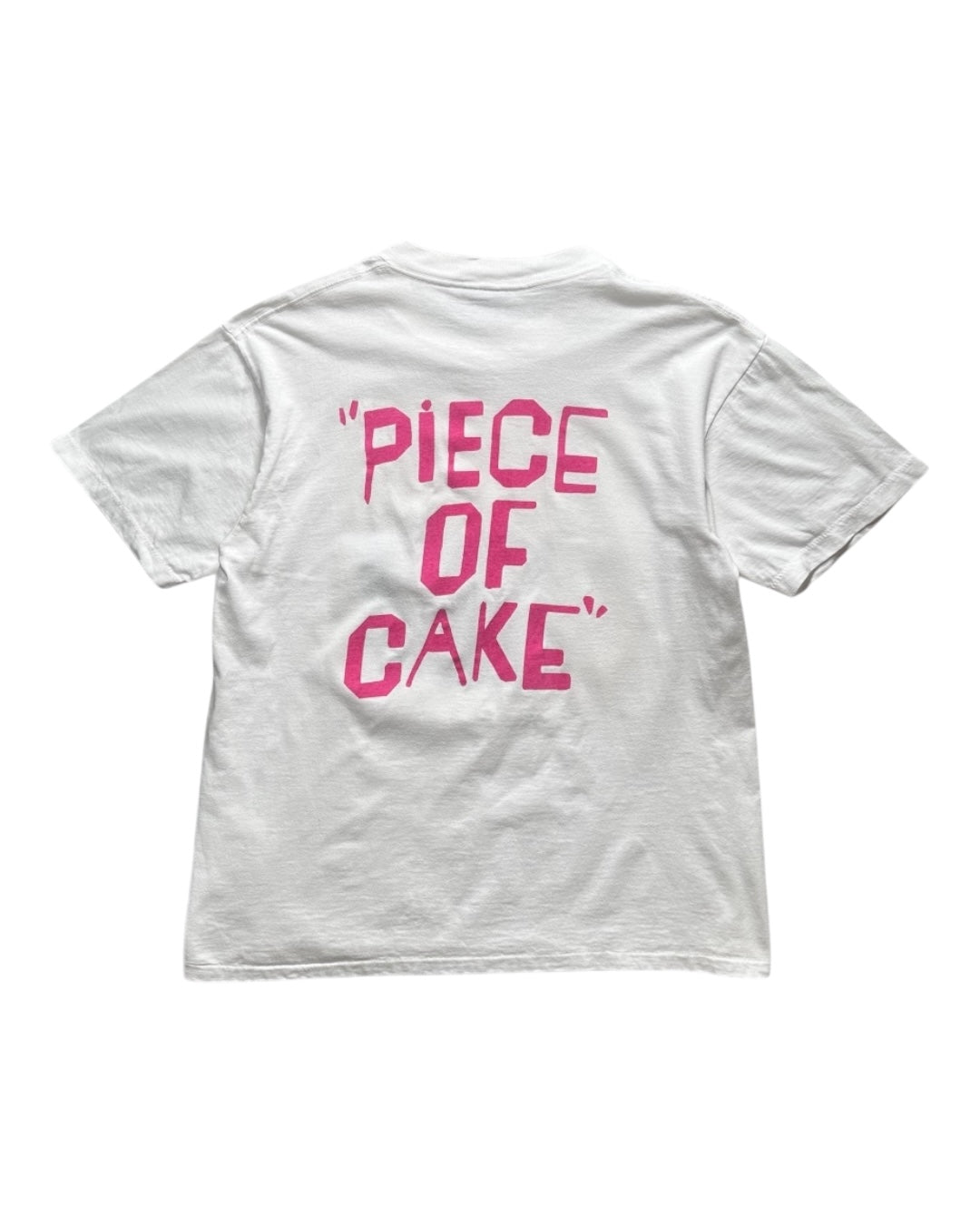 シアトルのグランジバンド Mudhoney の名盤『Piece Of Cake』。フロントにジャケットアートを思わせるポップなイラスト、バックにピンクの“PIECE OF CAKE”ロゴを大胆プリント。白ボディにイエロー×ブルー×ピンクが映える、遊び心あふれるデザインが印象的です。サイズL