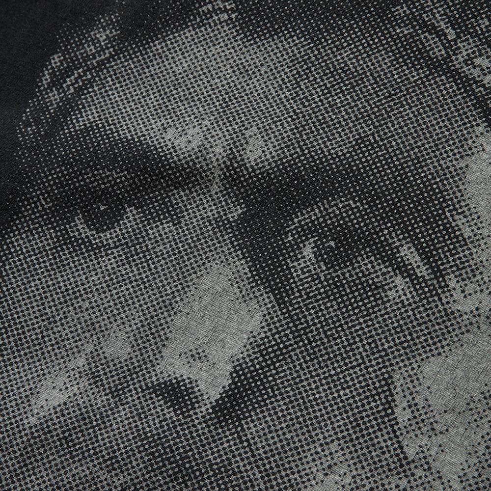 フロント中央には、映画『スカーフェイス』の主人公トニー・モンタナ(アル・パチーノ)の表情を切り取ったモノクロ調のポートレートが大きくプリントされています。顔の上部には、劇中の名台詞「Every day above ground is a good day.」が配置され、その下には作品タイトル「SCARFACE」の文字が重厚な書体でデザイン。全体的にドットの粗いプリントが施され、無骨で存在感のある一枚に仕上がっています。サイズXL