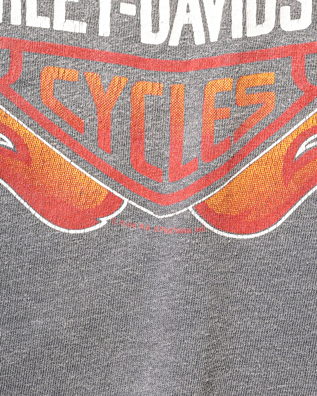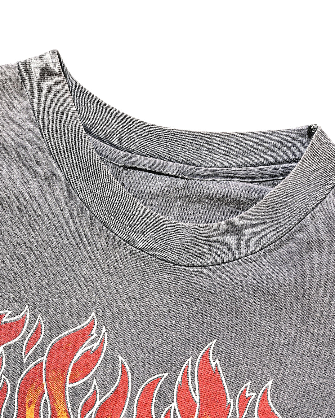 フロント中央には炎に包まれたハーレーダビッドソンのバーロゴが大きくプリントされ、右袖にグラデーションで描かれたフレイム柄が大胆に配置されています。バックには「Phil Peterson’s Harley-Davidson Miami Florida」のショップ名とロケーションが描かれ、ヤシの木やビーチ、バイク、アメリカンフラッグなど南国フロリダらしいモチーフがカラフルにプリント。経年によるフェード感が加わり、ビンテージ特有の風合いが存在感を引き立てます。ボディの雰囲気や片袖だけのフレイムなど歴史を感じさせる世界的にも評価の高い一枚かと思います。コピーライトあり。