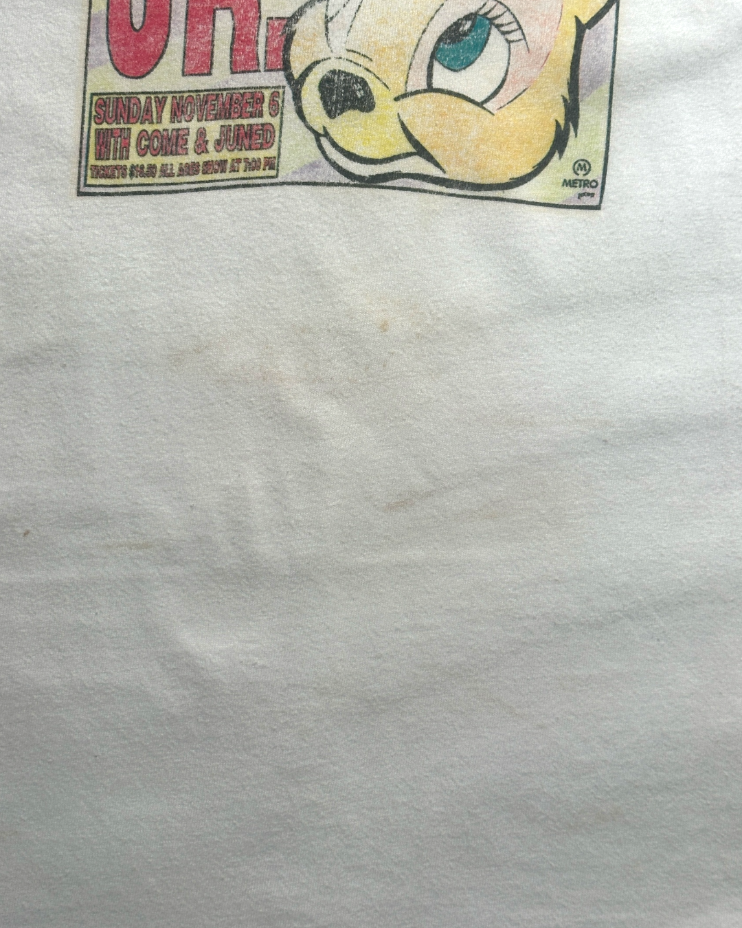 A poster design from Dinosaur Jr.’s one-day live show held on November 6, 1994, at The Metro, Chicago.The artwork was created by Frank Kozik, a renowned American graphic artist known for producing posters for alternative rock bands of the era. While Kozik created numerous works for grunge and alternative acts, pieces associated with highly regarded bands like Dinosaur Jr. are particularly rare and sought after.The body shows a natural vintage fade developed over time, adding to its authentic character and atmosphere. Among the globally celebrated catalog of Dinosaur Jr. vintage T-shirts, this stands out as an especially rare and collectible piece. Size L.
