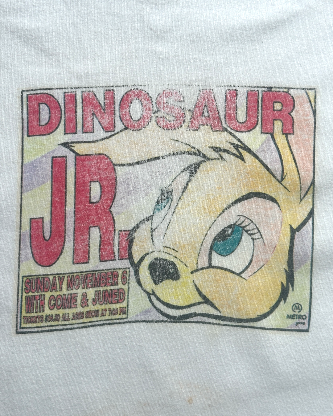 1994年11月6日、ダイナソーJr.がシカゴのライブハウスThe Metroで行った1Dayライブのポスター。作者は、オルタナティブ・ロック・バンドのポスターなどを手掛けていたアメリカのグラフィック・アーティストFrank Kozik。Kozikは、同時代のグランジ・オルタナティブバンドのためにさまざまな絵を描きおろしたが、なかでもダイナソーJr.のような人気バンドのものは希少性が高いと思います。経年によるボディのフェードもヴィンテージならではの雰囲気となっています。世界的に評価の高いダイナソーJr.のヴィンテージTシャツの中でも、希少性の高い一枚かと思います。サイズL