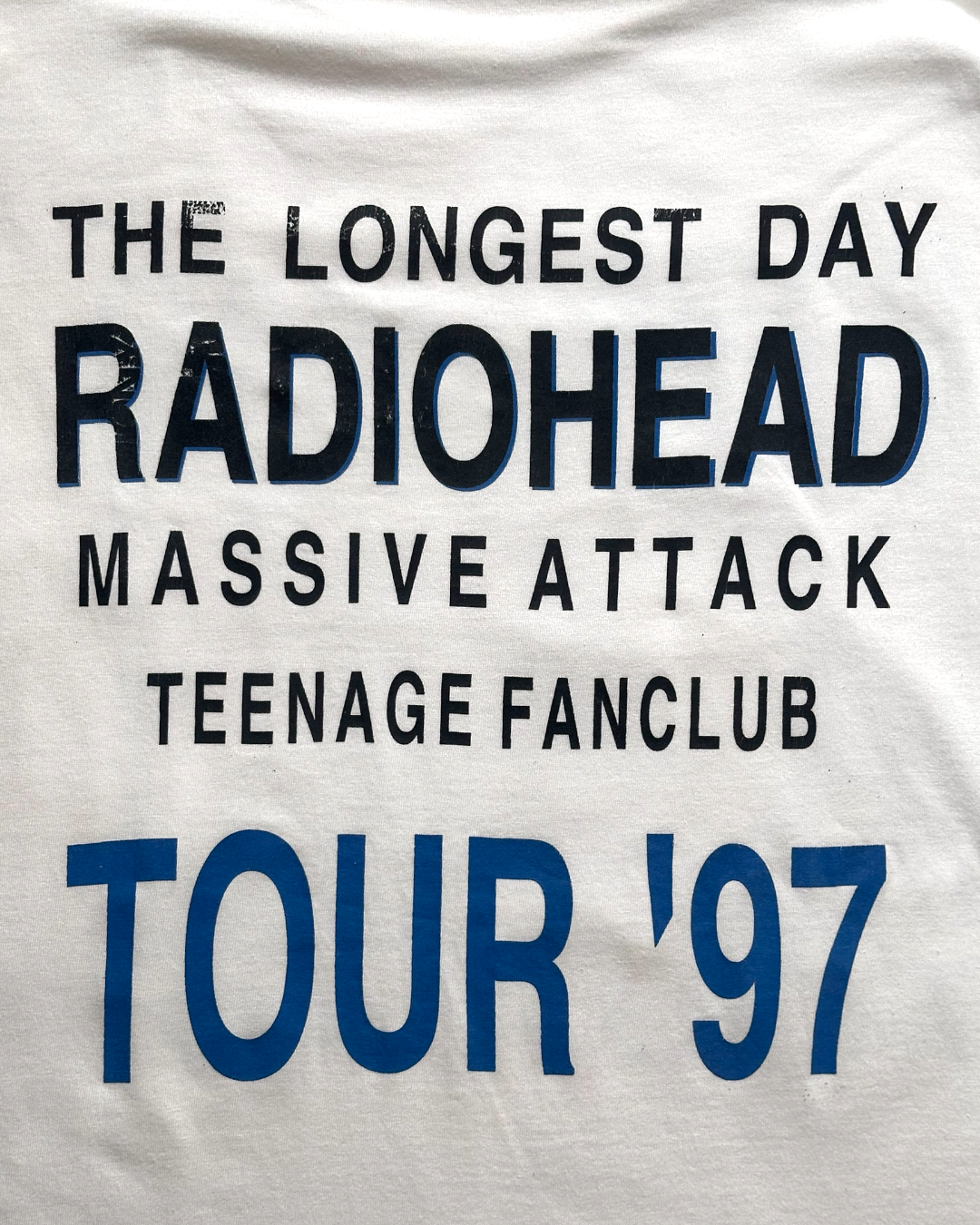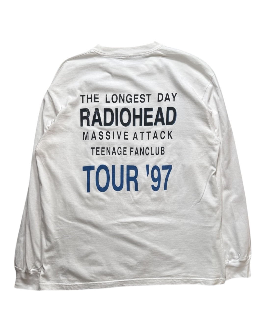 A 1990s Euro bootleg long-sleeve T-shirt from Radiohead.The back print reads “THE LONGEST DAY,” the name of a legendary outdoor event held on June 21, 1997, at the RDS Arena in Dublin, Ireland. The show took place just five days after the release of their era-defining masterpiece OK Computer—capturing the band at a moment of explosive energy, right before their rise to iconic status.Among fans who witnessed that era, this night is often remembered alongside their Glastonbury performance as one of the most important moments representing Radiohead in the 1990s.The greatest highlight of this piece is the impressive lineup printed on the back: Radiohead, Massive Attack, and Teenage Fanclub. These three acts, all at the forefront of the UK and Irish alternative scene at the time, are presented together—an exclusive detail unique to bootlegs produced to commemorate this specific event.A T-shirt featuring the names Radiohead, Massive Attack, and Teenage Fanclub on a single piece is exceptionally rare—an archival item that encapsulates a pivotal moment in music history.Size: XL