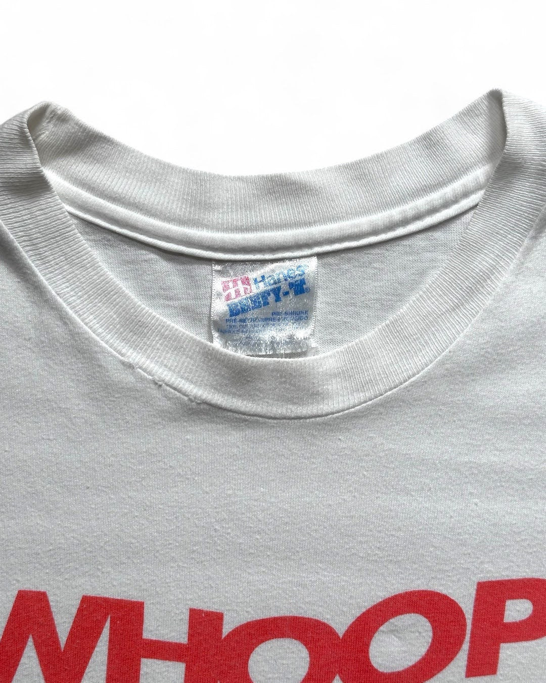 T-shirt for the 1993 film Sister Act 2: Back in the Habit. The front places “WHOOPI” in large red caps at the top, a full-length photo of Whoopi Goldberg in a nun’s habit at center, and the stacked title logo “SISTER ACT 2: BACK IN THE HABIT” in red at the lower left. A poster-like layout that makes effective use of negative space. Copyright line present. Size XL.