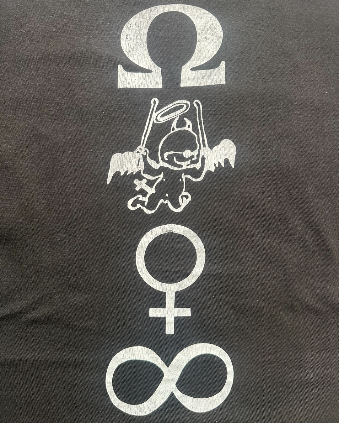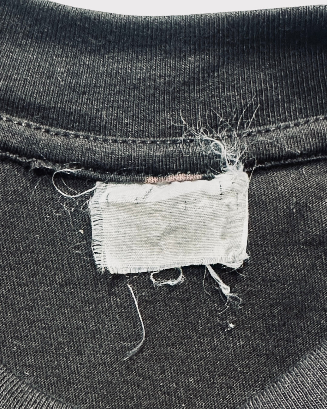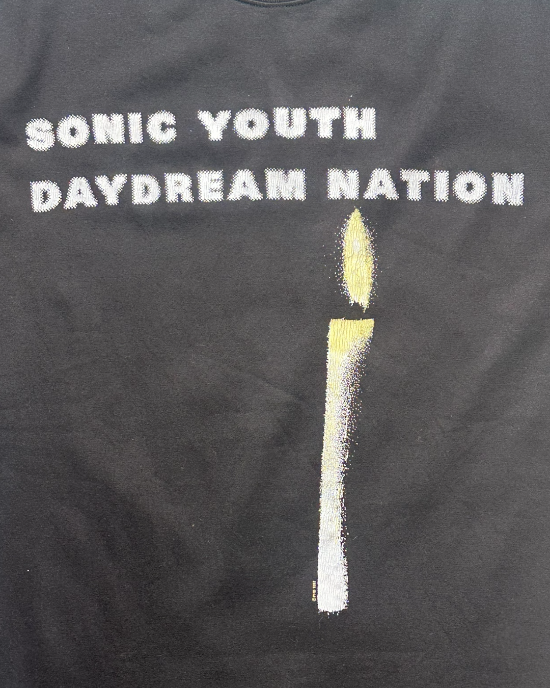 This T-shirt features the artwork from Sonic Youth’s 1988 masterpiece Daydream Nation. The candle printed on the front is Gerhard Richter’s 1982 painting Candle (Kerze), by one of the most celebrated contemporary artists in the world. Bold in its layout yet minimal in expression, it’s a highly regarded design globally. The graphic has been reissued many times over the years, but the original edition with the back print, like this one, has a truly unmatched presence. The cracking of the print and the worn-in feel of the body give it outstanding character. Copyright on print.