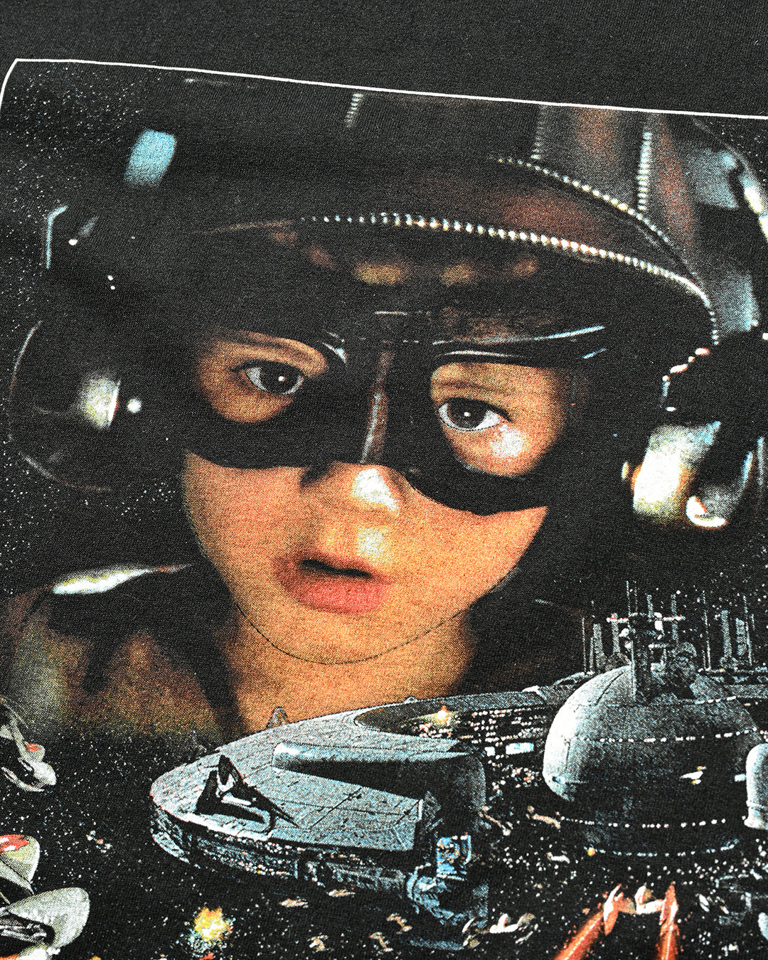 Centered on the front, a thin white-framed square presents a poster-like collage: a close-up of young Anakin in his helmet on the upper half, layered with a space battle of Naboo N-1 starfighters below. “EPISODE I” appears at the bottom in a serif type with a soft glow. Gritty halftones, natural fading, and fine ink cracking emphasize the vintage feel from the film’s original release era. Size XL.