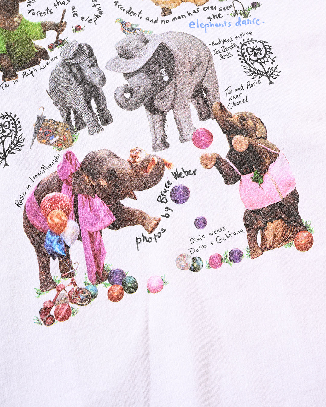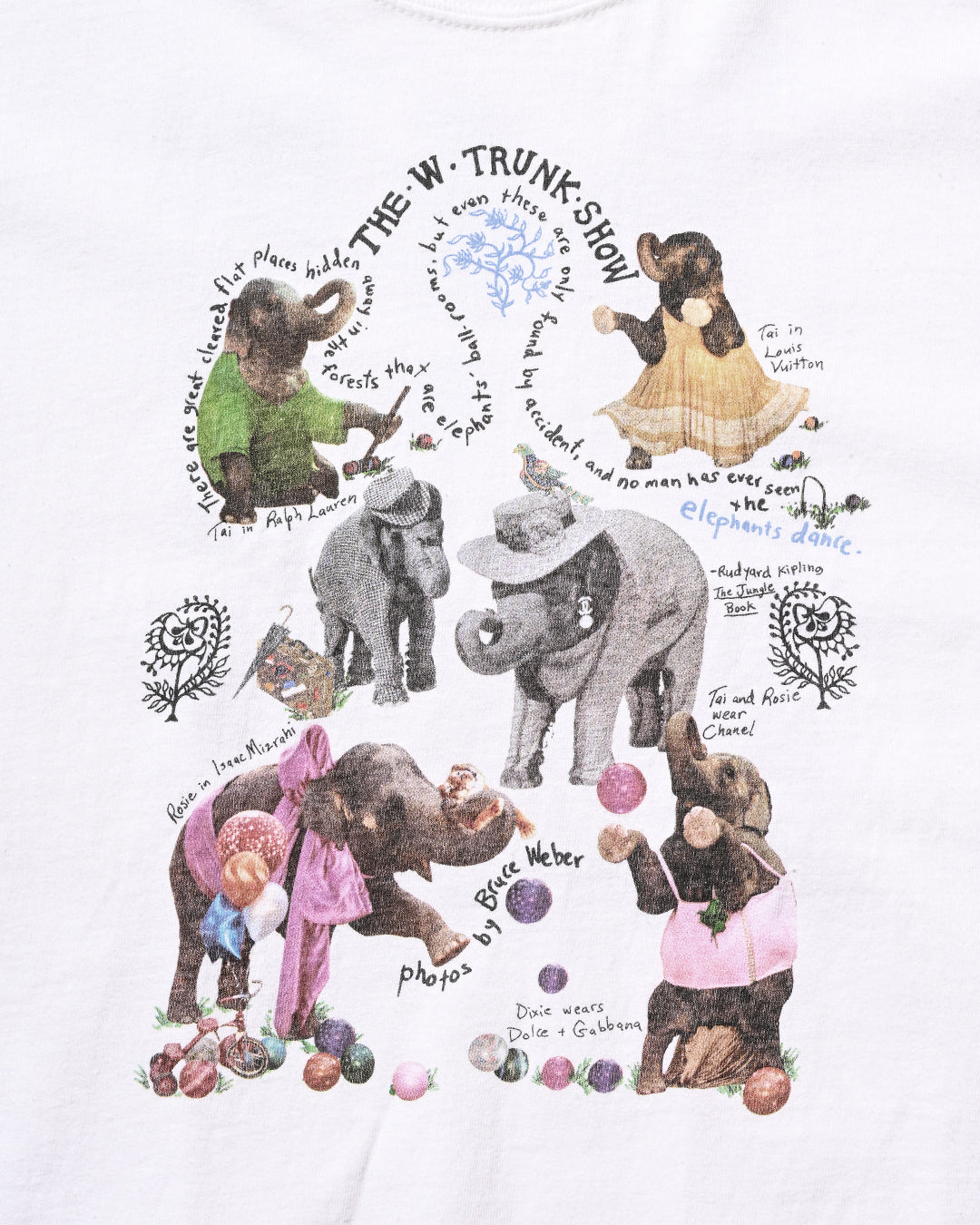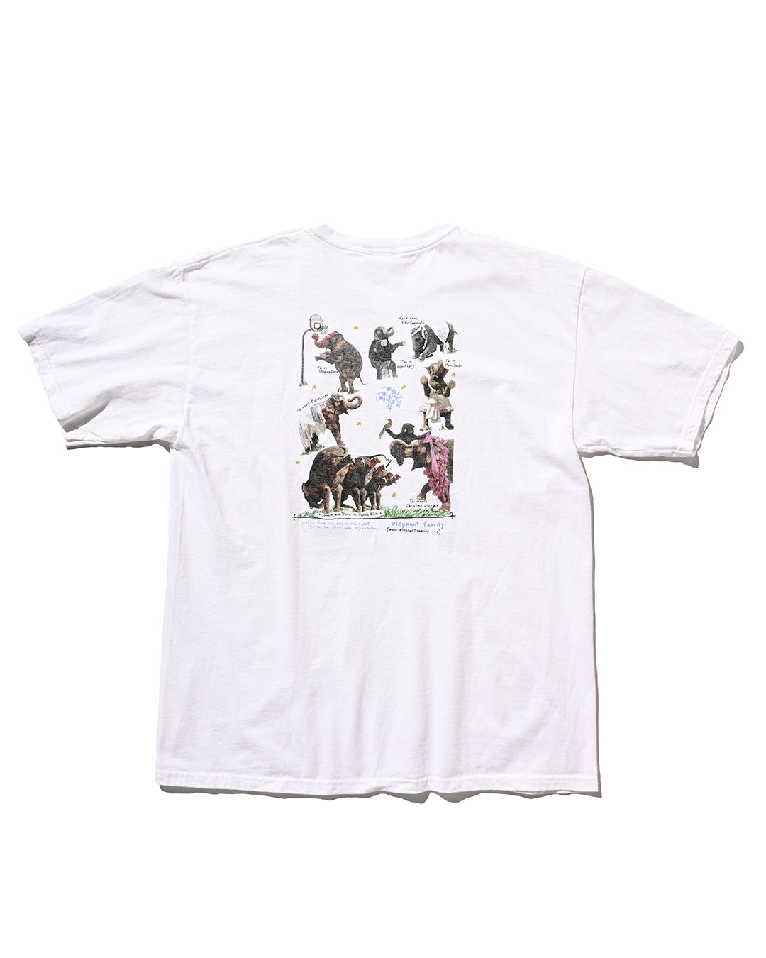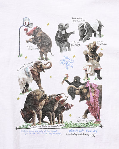 2005年にNYのFashion誌『W magazine』がアジア象の保護団体『Elephant Family』と制作したチャリティーTシャツ。シャネル、ルイヴィトン、ラルフローレン、ドルチェ&ガッバーナなどを身につけた象たちが前後にプリントされ、その撮影したのは、ブルース・ウェーバーと大変豪華なラインナップとなっています。比較的小さい個体が多く、こちらのLサイズが最も大きいサイズであったかと思います。コンディション良好、サイズL
