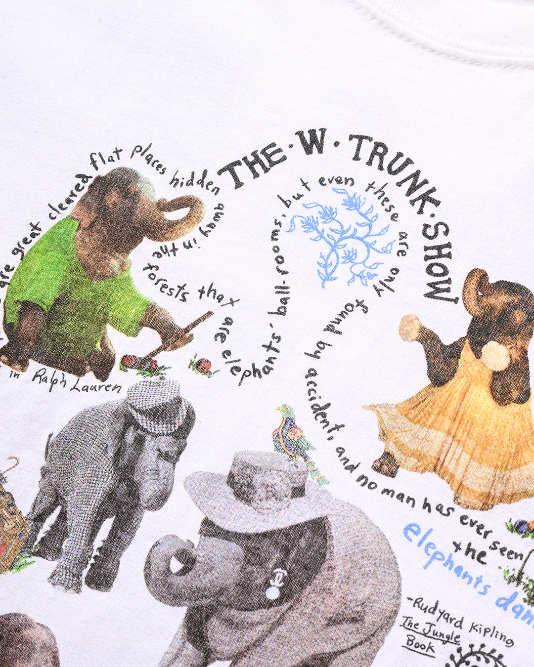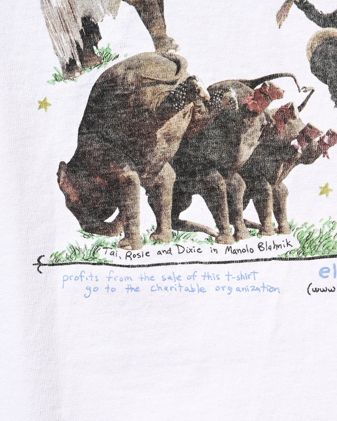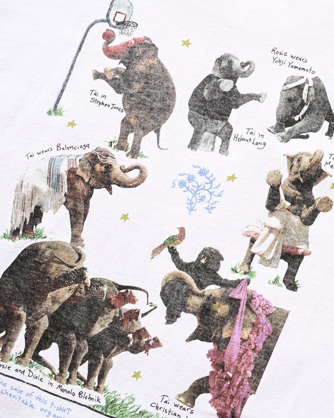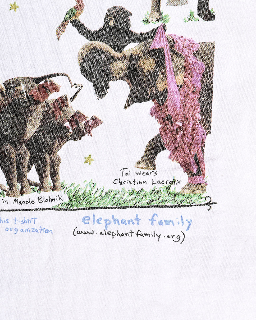 2005年にNYのFashion誌『W magazine』がアジア象の保護団体『Elephant Family』と制作したチャリティーTシャツ。シャネル、ルイヴィトン、ラルフローレン、ドルチェ&ガッバーナなどを身につけた象たちが前後にプリントされ、その撮影したのは、ブルース・ウェーバーと大変豪華なラインナップとなっています。比較的小さい個体が多く、こちらのLサイズが最も大きいサイズであったかと思います。コンディション良好、サイズL