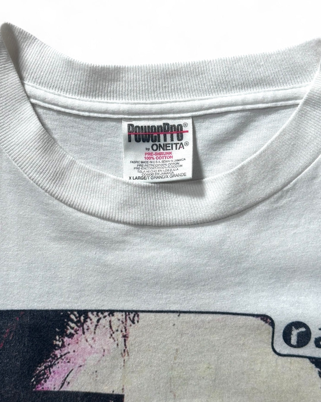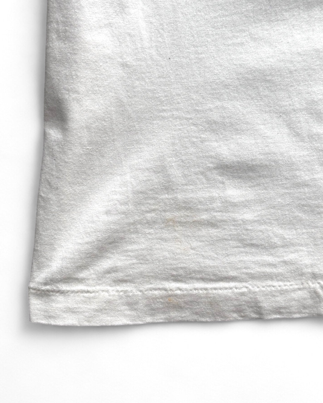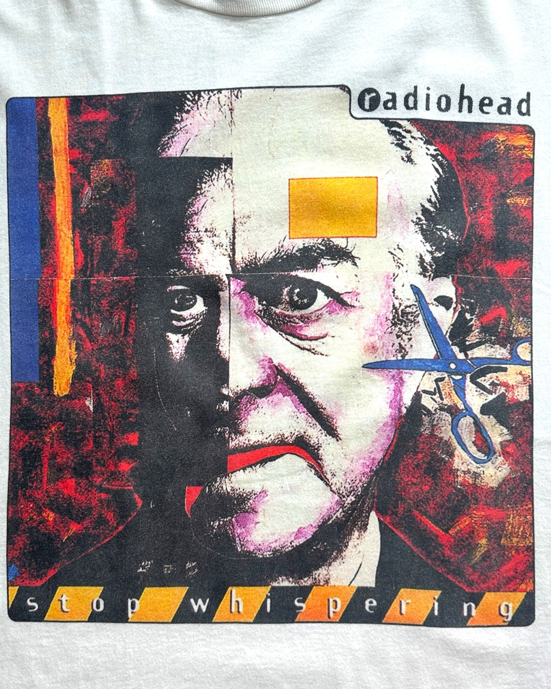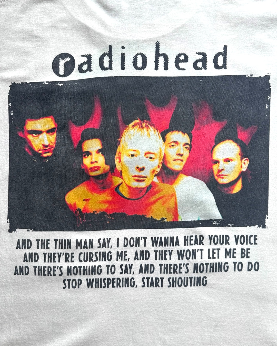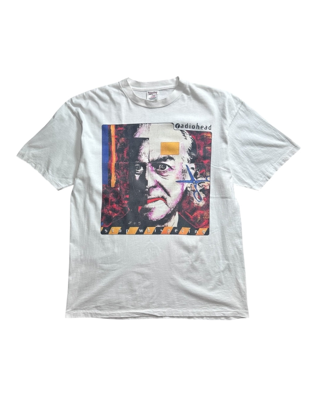 レディオヘッドのデビューアルバムPablo Honeyに収録されてるStop WhisperingのTシャツ。バックプリントに一部曲の歌詞がプリントされてるデザインがクールな1枚です。現存数が少なく、非常に希少価値が高いコレクタブルな一枚かと思います。サイズXL
