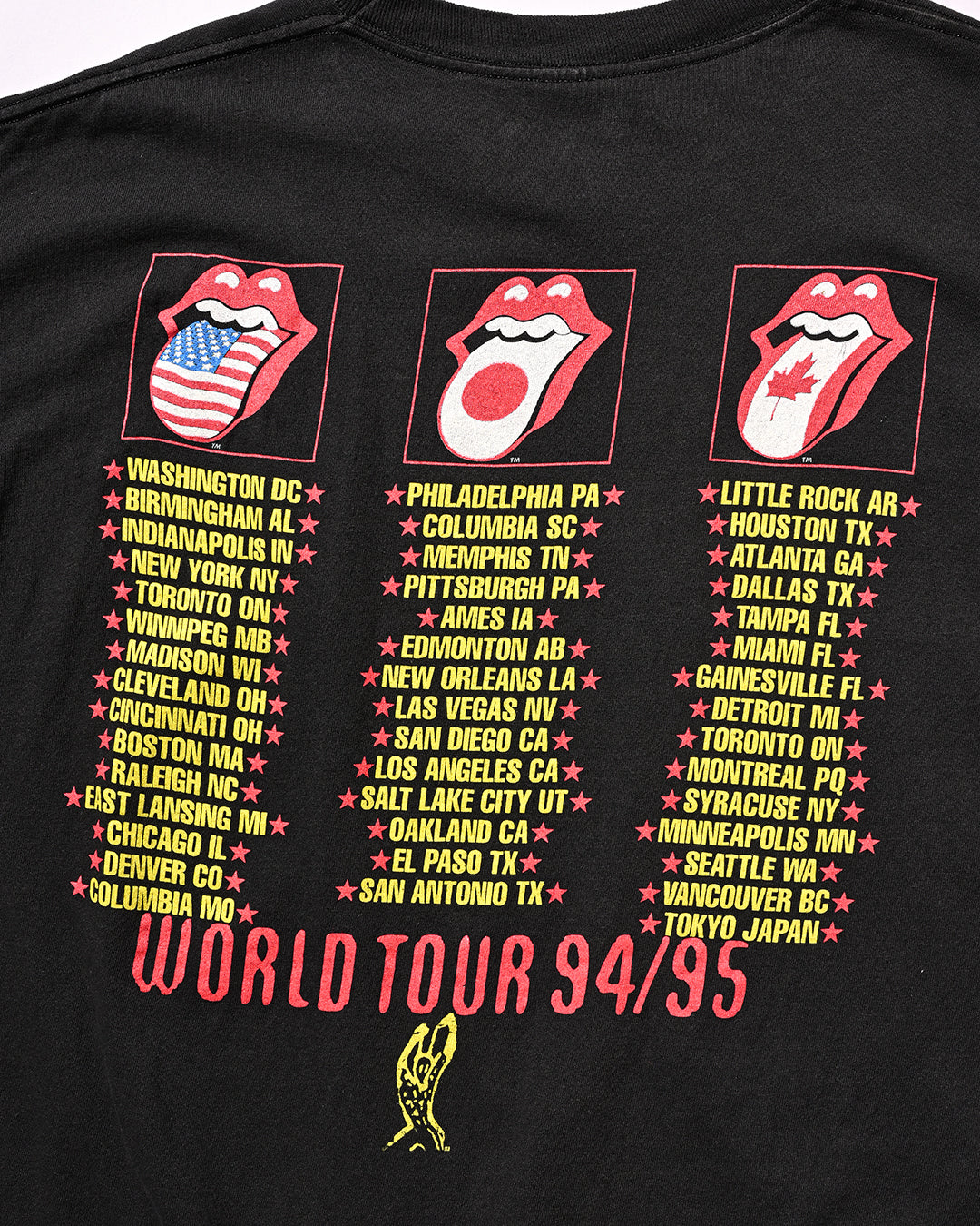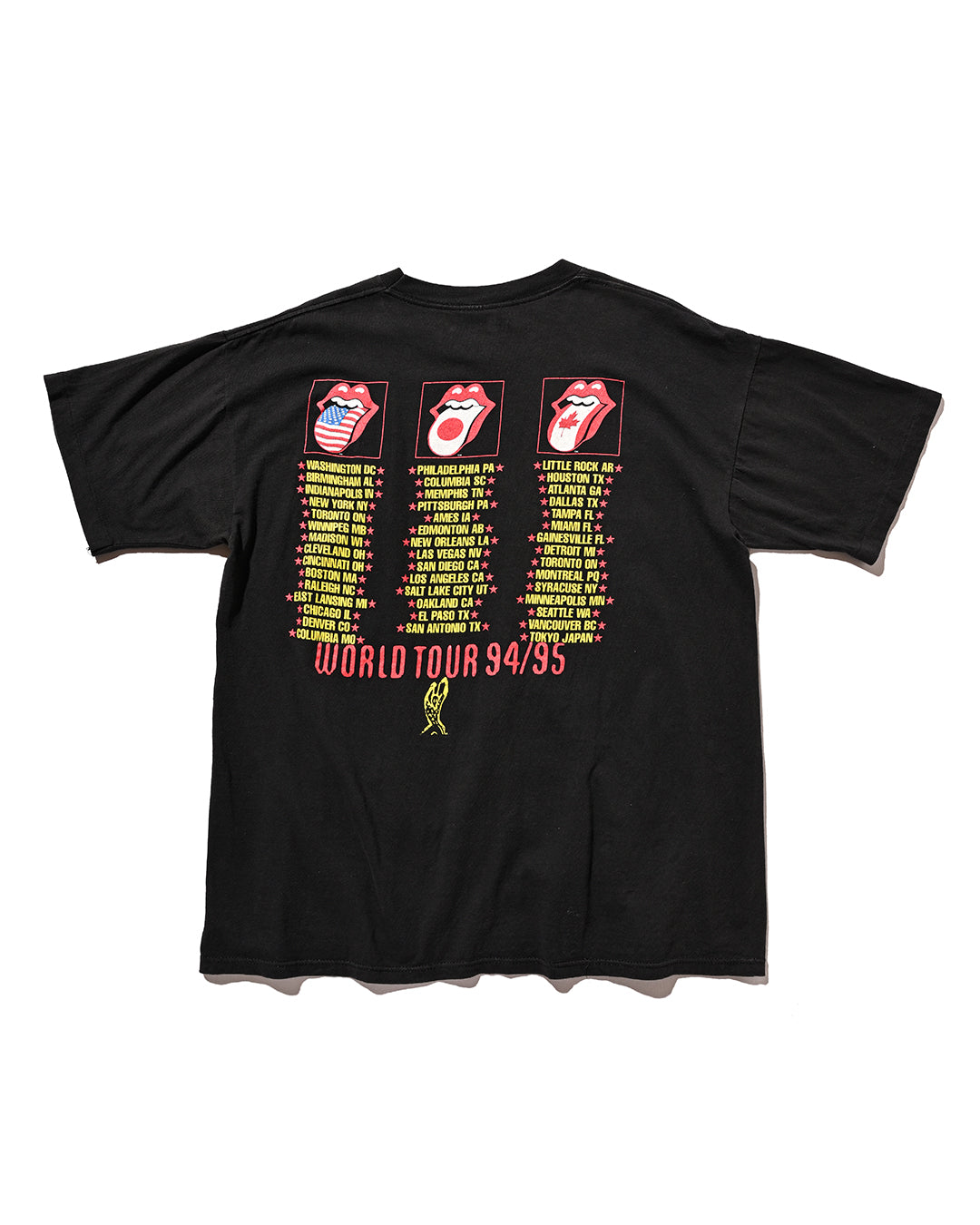 Rolling Stonesの1994~95年に行われたWORLD TOURの一枚。フロントには、94年リリースのアルバム「Voodoo Lounge」のアートワークが大きくプリントされ、バックにロゴマークとツアー日程が描かれています。コピーライトあり、サイズXL